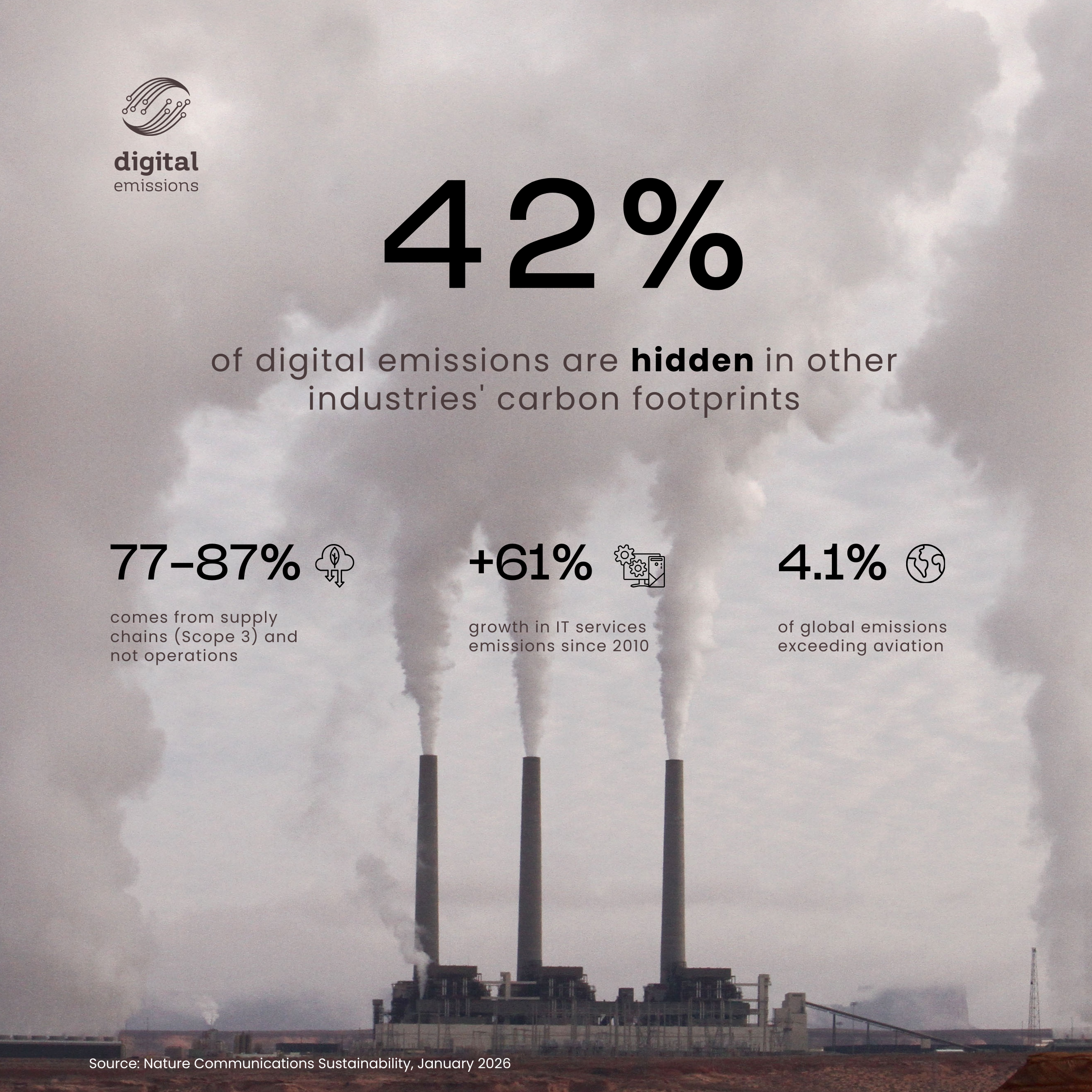 Nearly half of the carbon footprint of our digital world has been hiding in plain sight. A landmark study published in January 2026 in Communications Sustainability, a Nature Portfolio journal, analyzed a full decade of global economic data and found that digital industries are responsible for 4.1% of global greenhouse gas emissions - roughly 2,141 million metric tons of CO2 equivalent in 2021. That's a significant number on its own. But here's what makes this finding especially consequential: 42% of those emissions don't show up as "digital" in anyone's climate accounting. They're embedded in cars, appliances, financial services, and industrial systems, i.e., everywhere digital components serve as intermediate inputs in the broader economy.